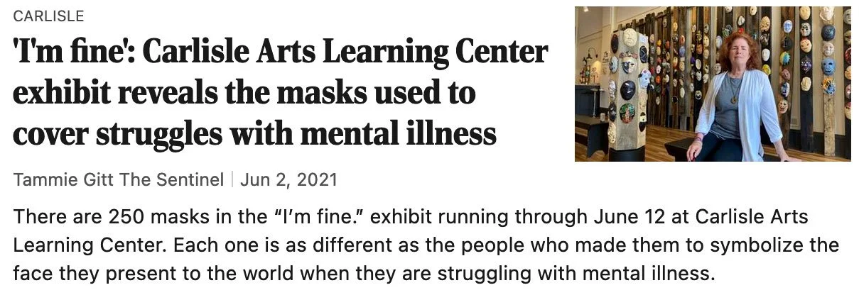 "“I'm fine: Carlisle Arts Learning Center exhibit reveals the masks used to cover struggles with mental illness”, The Sentinel, June 2021. 250 masks exhibited at the Carlisle Arts Learning Center through June 12th. I’m fine': Carlisle Arts Learning Center exhibit reveals the masks used to cover struggles with mental illness